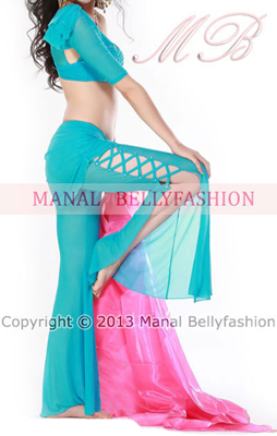 Traje Gala en Malla elasticada Turquesa. Pantalón con sobrefalda